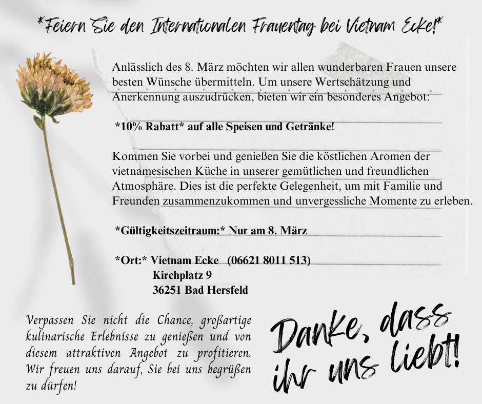 Kommen Sie vorbei und genießen Sie die köstlichen Aromen der vietnamesischen Küche in unserer gemütlichen und freundlichen Atmosphäre. Dies ist die perfekte Gelegenheit, um mit Familie und Freunden zusammenzukommen und unvergessliche Momente zu erleben.