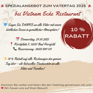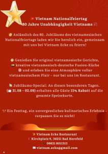 Am 03. Oktober 2025 lädt das Vietnam Ecke Restaurant Sie herzlich ein, gemeinsam den Nationalfeiertag...